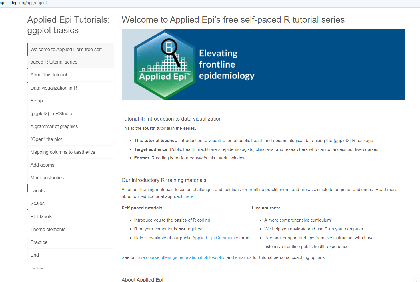 To access these tutorials, simply create a free Applied Epi account. You do not need to install R to use the tutorials.